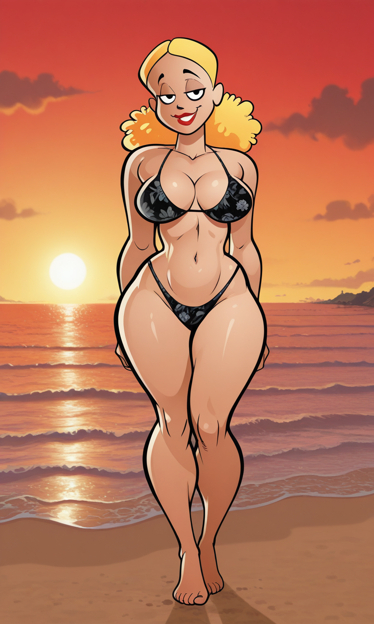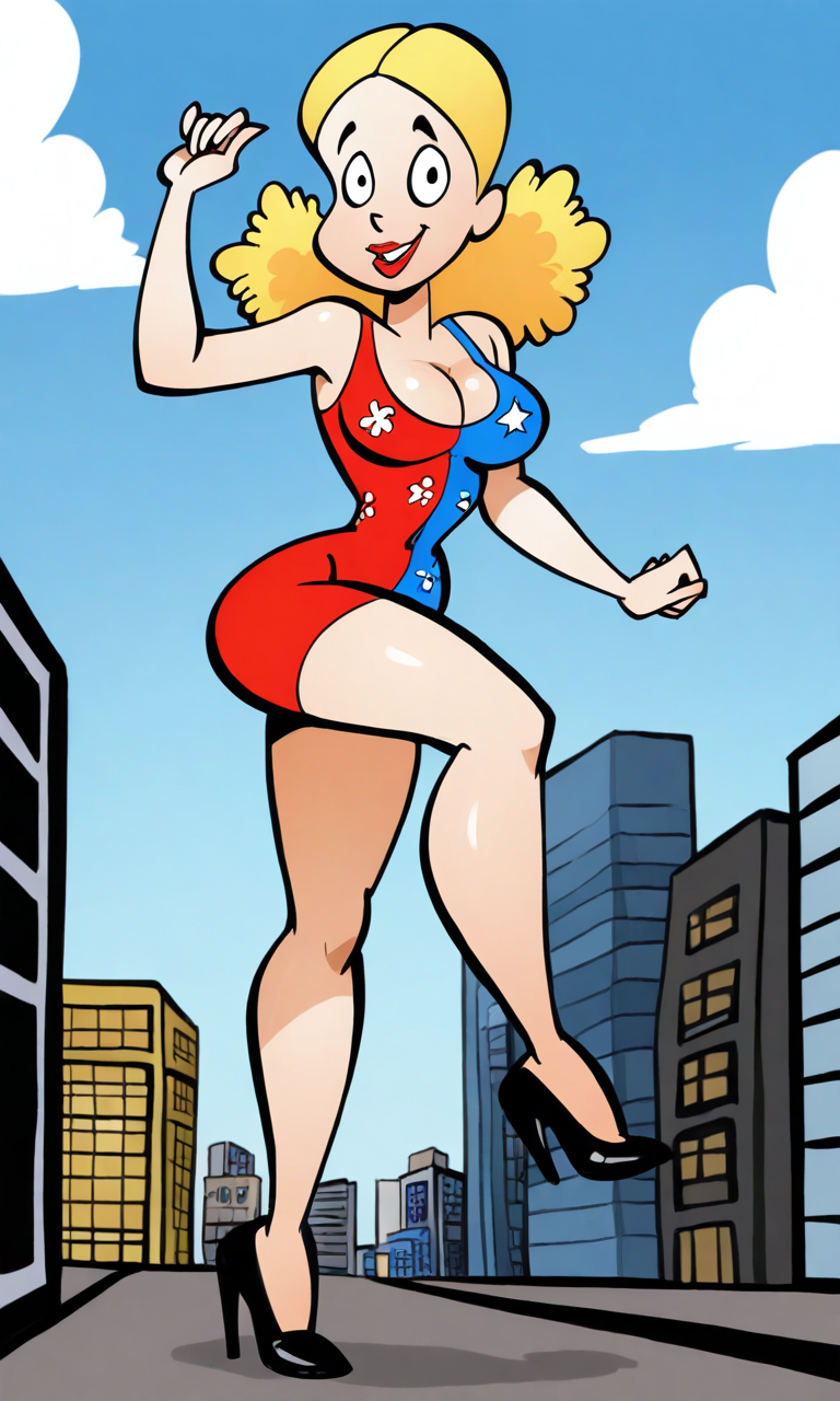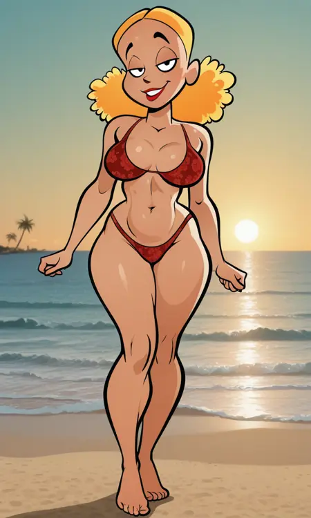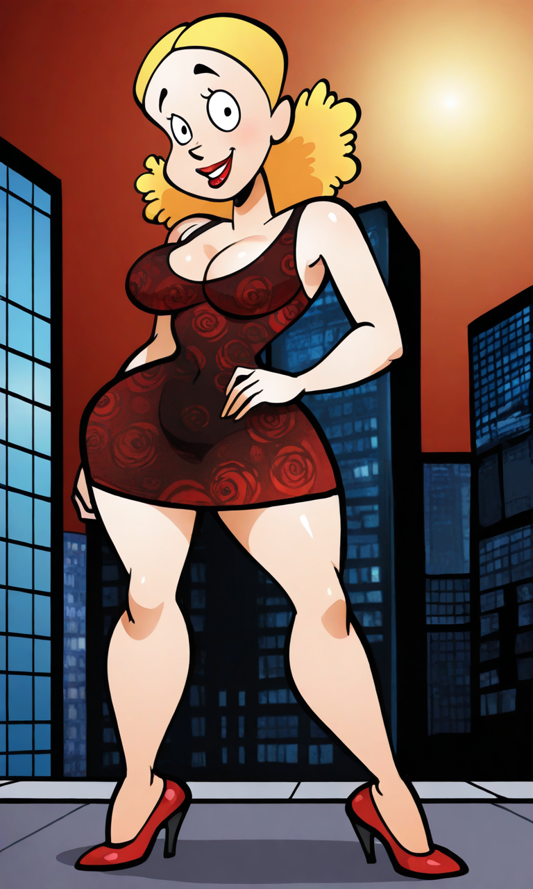 Palomita, 1girl, blonde long hair, curly ends, black eyes, red lipstick