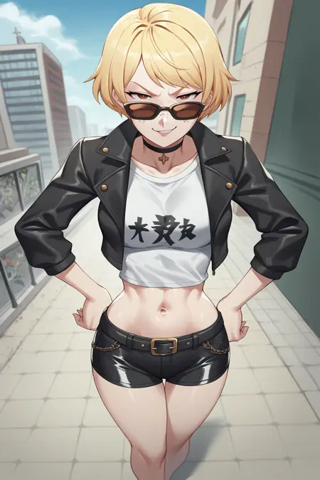 For her outfit, please use: NSDorothyFE6, freckles, brown hair, short hair, closed eyes, black fingerless gloves, armor, orange shirt, sleeveless, pants under skirt, brown skirt, pants