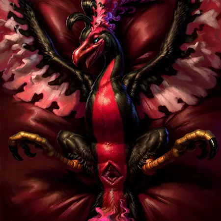 補助タグ: spread_wings, red_body, black_body, red_talons, red_beak, claws, bifid_tail