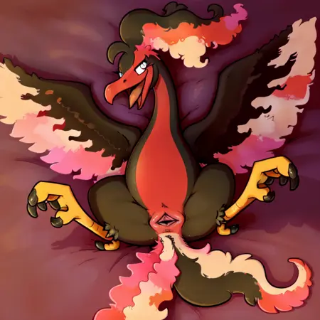 より良い生成のために、アクティベーションタグ「galarian_moltres」に加えて、「spread_wings, red_body, black_body, red_talons, red_beak, claws, bifid_tail」を追加することをお勧めします。これにより、元のデザインに近づきます。