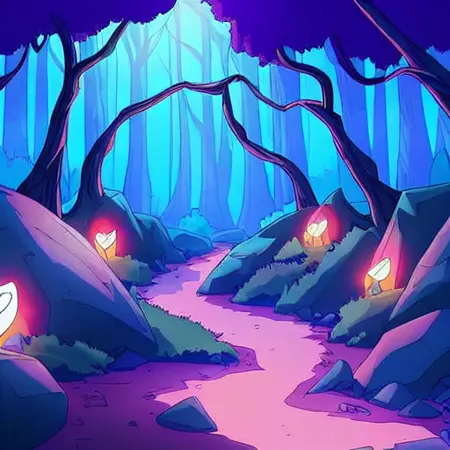 由于训练时使用了正则化图像,该森林关键词能够生成随机的森林场景。在提示中可加入更多环境元素,如水晶岩石花朵小屋。最后,还可融合时间设定:日出黎明日落傍晚