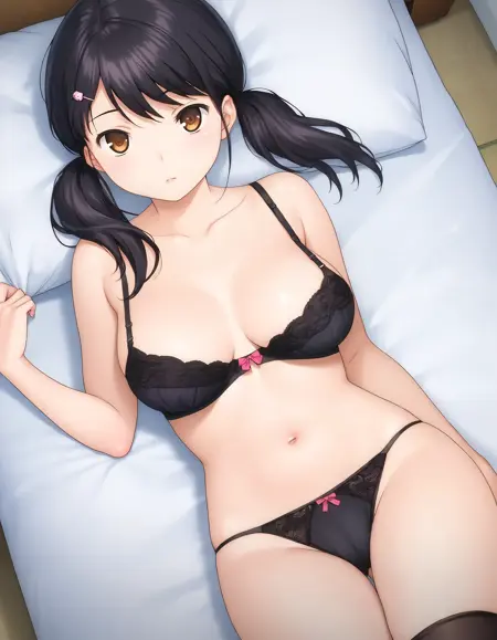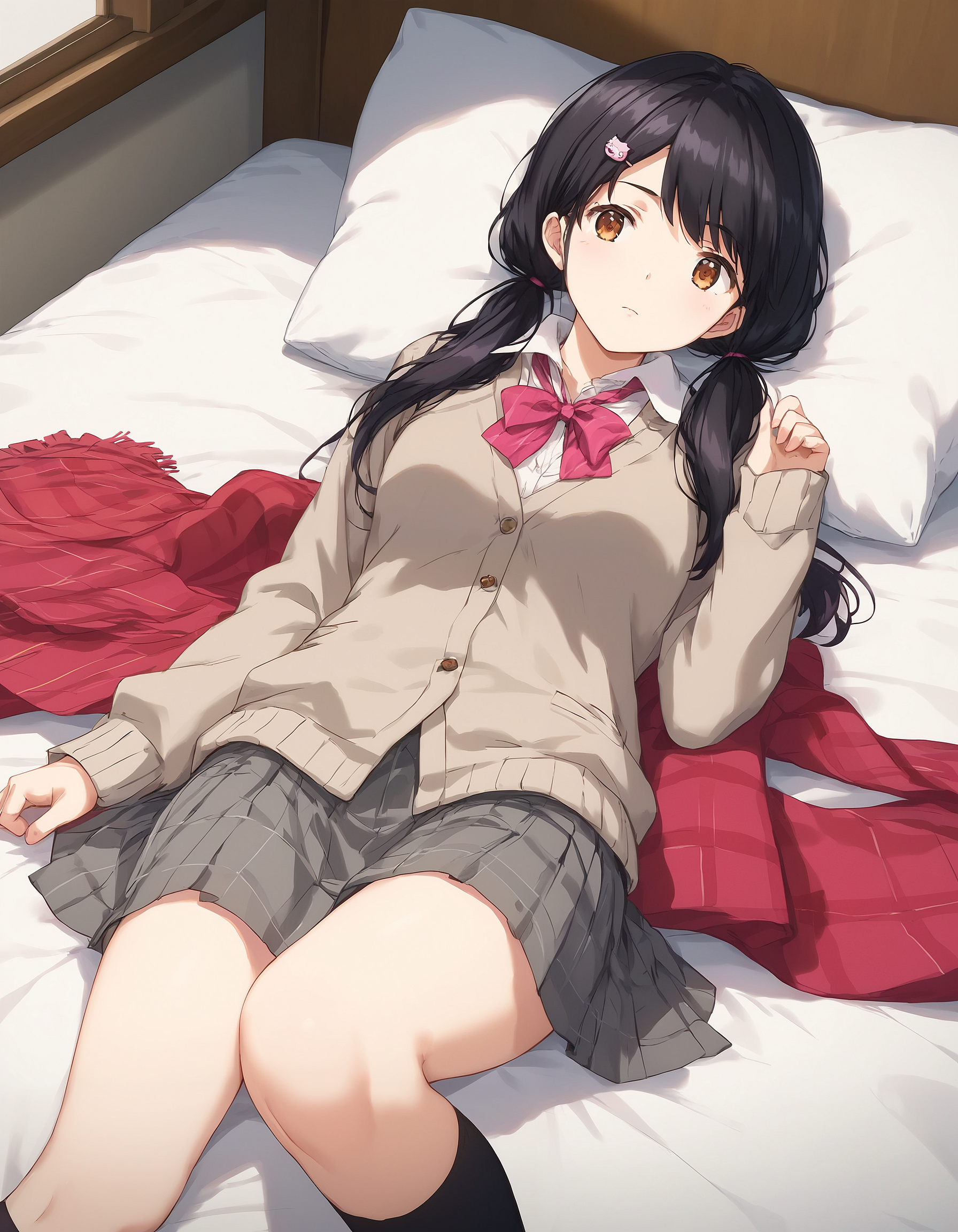 角色:1girl,solor,AkaneMisaki,棕色眼睛,黑发,双马尾,刘海,发夹,粉色发夹,