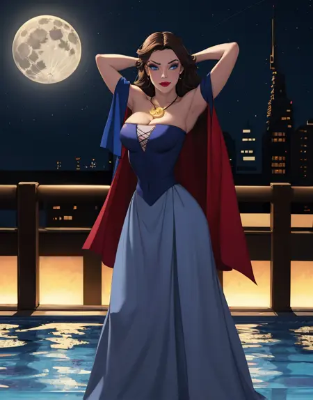 1girl, blue eyes, brown hair, long hair, narrow waist, shell necklace, lipstick, makeup, jewelry, necklace, colored skin, large breasts, red lips,