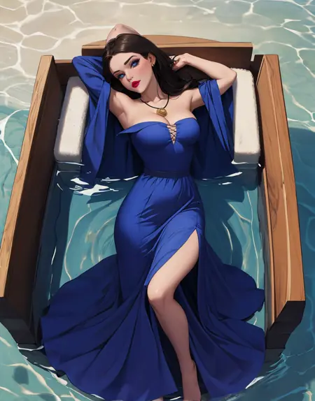 blue dress, cleavage, bare shoulders, long skirt, long dress, off shoulder, blue cape, cloak, off-shoulder dress, strapless dress,
