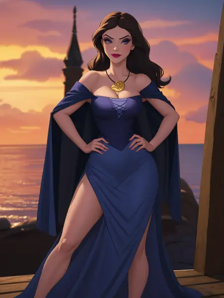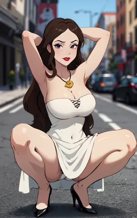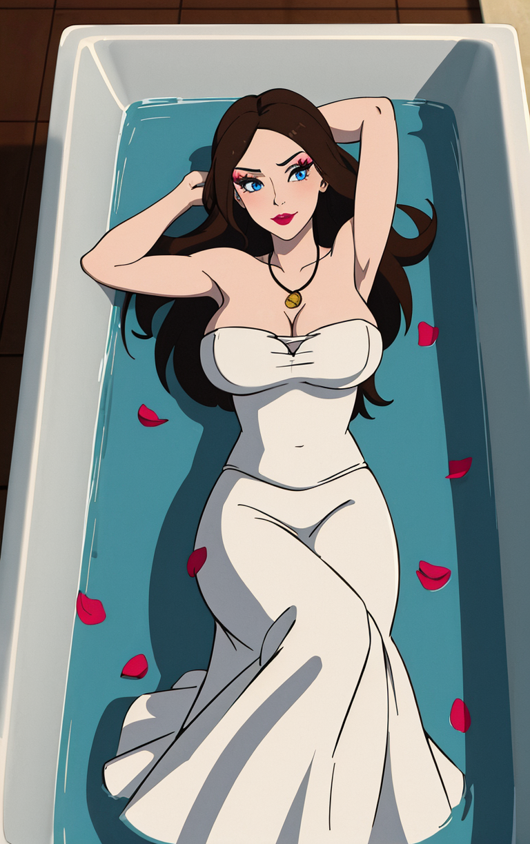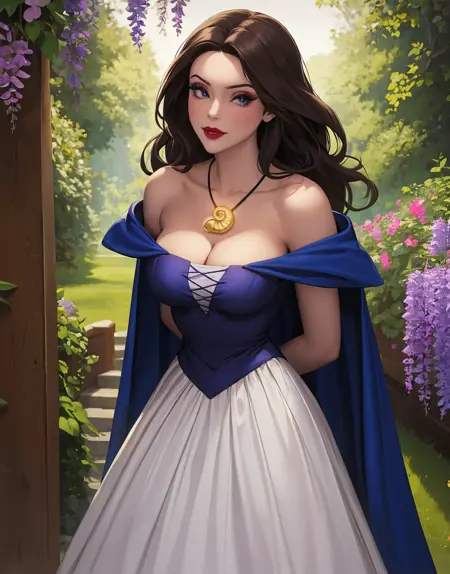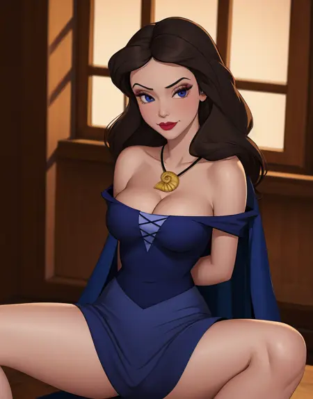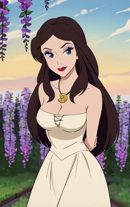 1girl, blue eyes, brown hair, long hair, narrow waist, shell necklace, makeup, lipstick, jewelry, necklace, red lips, medium breasts, pendant, eyeshadow, mature female,