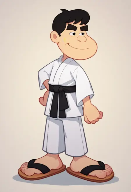 Sushiroco_V2, black hair, 1boy, black eyes, toes, sandals, thick eyebrows, asian male, large feet, white martial arts uniform with a black belt brown sandals, slant eyes,