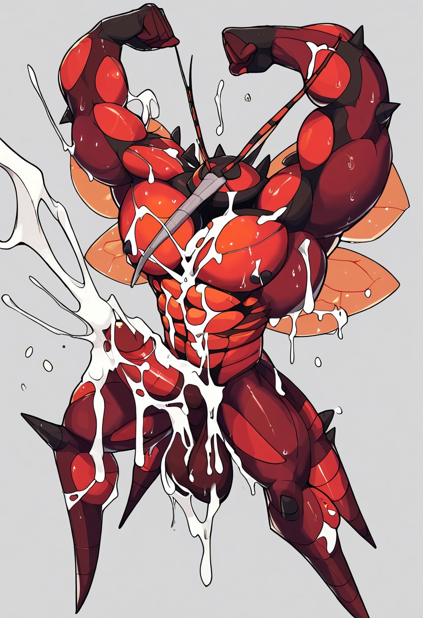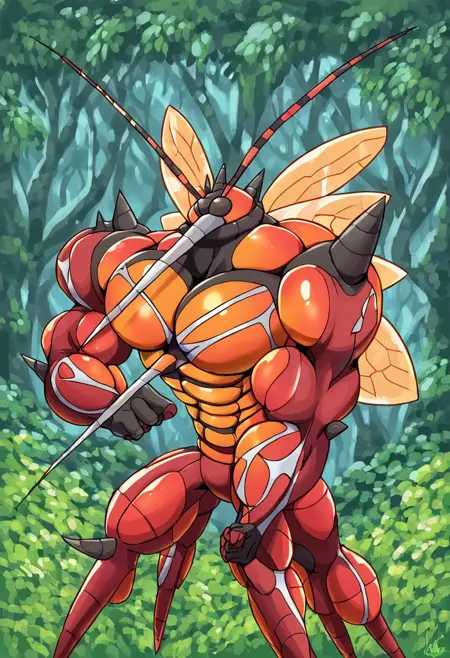 以下のタグの使用を推奨します:buzzwole, male, 1boy, abs, muscular male, insectoid, misquito, red, 4 legs, long thin proboscis, hyper muscle, pokemon, pokemon creature, yellow insect wings