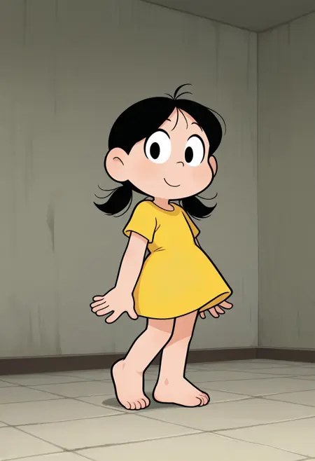 MagaliTDM, 1girl, short-sleeved yellow dress, black hair, three strands of hair that seem to resemble pigtails, black eyes, short,