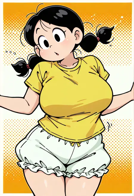 MagaliMaggyTDM, 1girl, bright yellow shirt, short black hair, three strands of black hair that seem to resemble pigtails, white bloomers, black eyes, oval shaped eyes, big cartoonish eyes, short, chibi