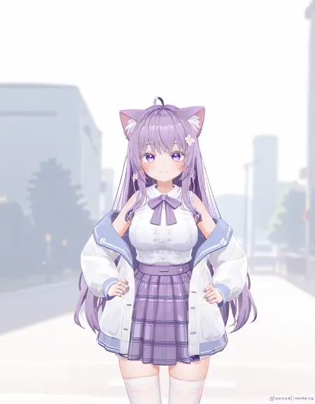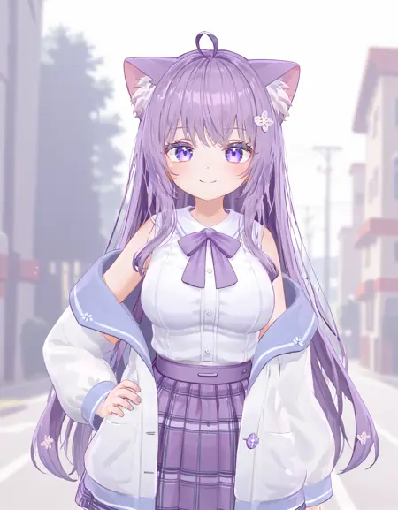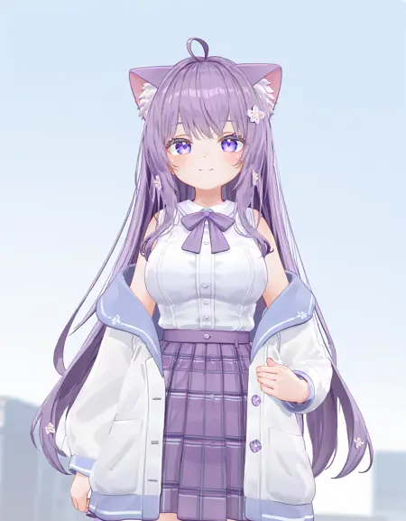 Moe: vrchat moe, moe_AA, 1girl, solo, thighhighs, purple skirt, jacket, shoes, sleeveless shirt, white shirt, hair flower, purple bow