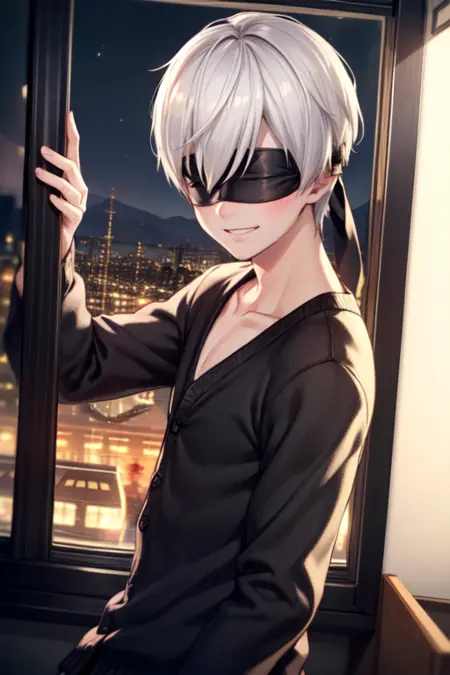 トリガー語: 9s、白髪、目隠し、黒い目隠し、手袋、チョーカー、ジャケット、ショートパンツ、ブーツ、長袖