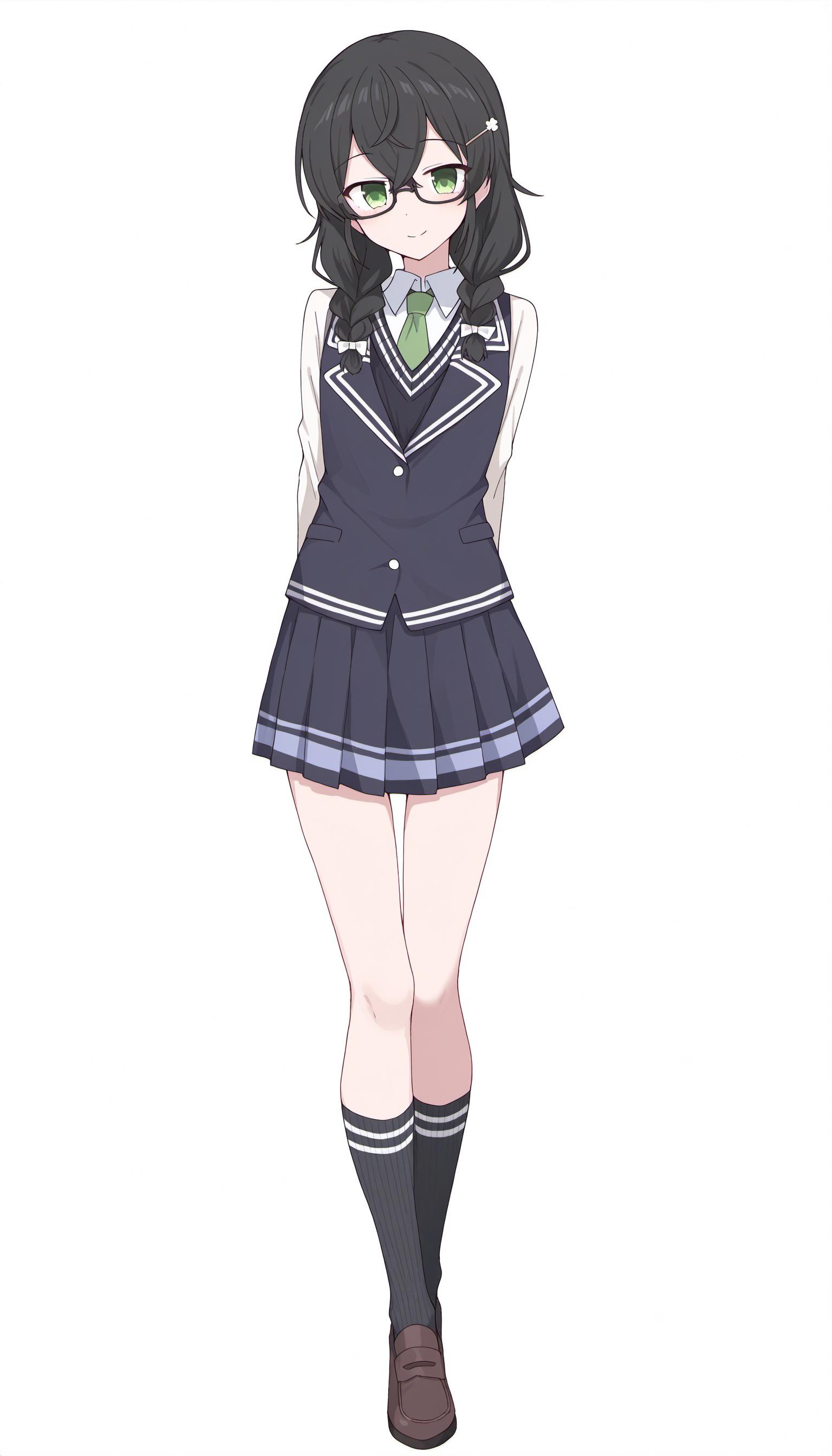 hanakuma chifuyu, 검은 머리, 파란 치마, 리본, 땋은 머리, 가슴 주머니, 갈색 신발, cevio, 컬러드 셔츠, 교차 앞머리, 평평한 가슴, 초록색 눈, 초록색 넥타이, 눈 사이 머리, 머리 리본, hanakuma chifuyu, 발뒤꿈치 올린 자세, 고해상도, 로퍼, 긴 머리, 넥타이, 플렉트럼, 주머니, 제3자 출처, 셔츠, 신발, 긴 소매, 안경, (흰 긴 소매:1.2), 블레이저, 치마, 양말, 쌍 땋은 머리, 흰 셔츠, 흰 양말, lora:otaru\_shiokaze\_pony\_v1:1