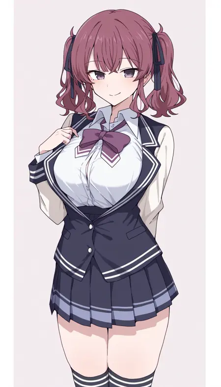 natsuki karin, 블레이저, 큰 가슴, 갈색 눈, 컬러드 셔츠, 드레스 셔츠, 재킷, 중간 앞머리, 큰 가슴, 주근깨, 눈 아래 주근깨, 접힌 치마, 붉은 머리, 머리 리본, 보라색 리본타이, 학교 유니폼, 셔츠, 치마, 허벅지 양말, 트윈테일, 흰 긴 소매, 긴 소매, 흰 소매, lora:otaru\_shiokaze\_illustrius\_v1:1
