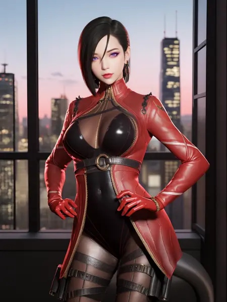 - CFchuanshuonvdiQF, 1girl, solo, breasts, purple eyes, gloves, black hair, jewelry, short hair, looking at viewer, earrings, bodysuit, makeup, leotard, thigh boots, medium breasts, zipper, pantyhose, lips, leather, jacket, latex, thigh strap, cityscape, night, hand on hip,