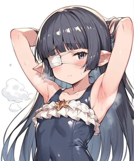 lunalu (granblue fantasy), harvin, 尖った耳, 白い眼帯, 黒髪, 長い髪, まっすぐな前髪, フリル, ショートスタック, 黒い頭部装具, ベレー帽, 髪飾り, 黒いベスト, 白いシャツ, 広い袖, 黒いドレス, ボウタイ, 首元のボウタイ, フリル付きドレス, フリルスカート, パンティーホース, 黒いパンティーホース, 黒い靴, ピンクのポーチ,