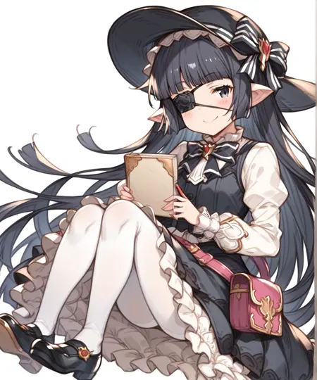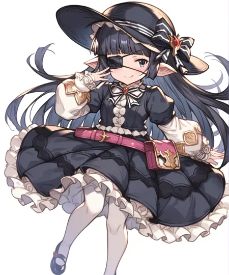 lunalu (granblue fantasy), harvin, 尖った耳, 黒い眼帯, 黒髪, 長い髪, まっすぐな前髪, フリル, ショートスタック, 黒い頭部装具, 黒いサンハット, 髪飾り, 黒いベスト, 白いシャツ, フリル付きのふわふわ長袖, 中央のフリル, 黒いドレス, ボウタイ, 首元のボウタイ, フリル付きドレス, 黒いスカート, フリルスカート, パンティーホース, 白いパンティーホース, 黒い靴, ピンクのポーチ,
