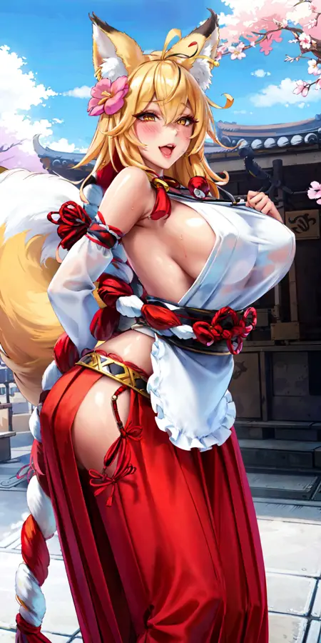 メインタグ:thefox、黄色い目、金髪、狐娘、狐の耳、狐の尾、非常に長い髪、編み髪