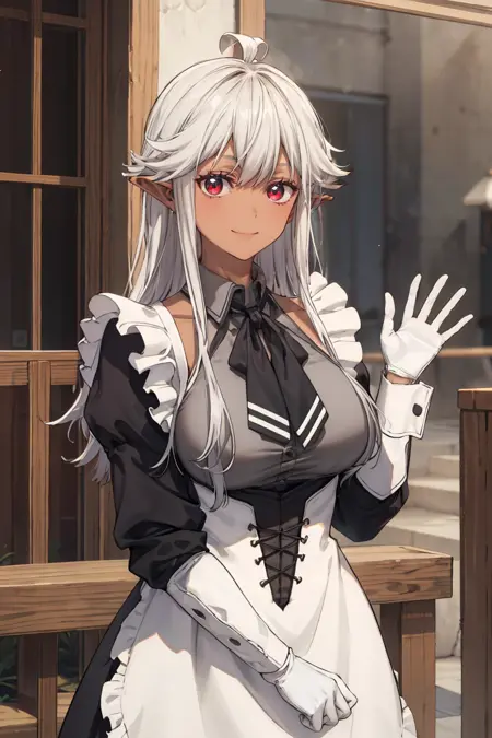 服装:女仆装,女仆围裙,灰色上衣,黑色领结,白色手套