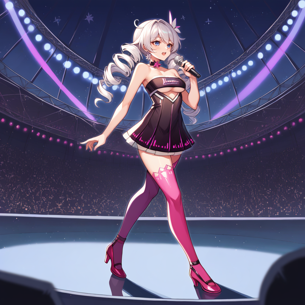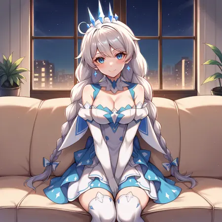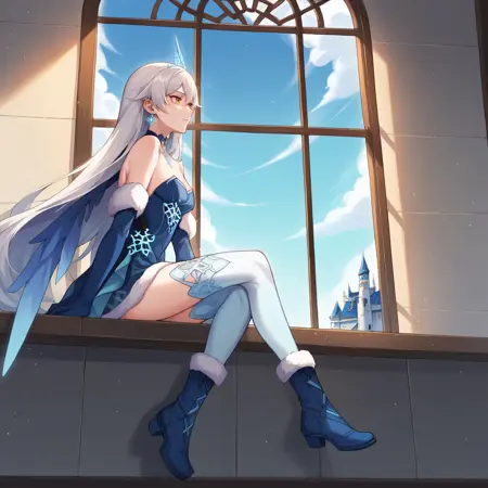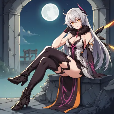 KianaHi3, Fol006, Kia_Evn, ponytail, long hair, white hair, blue eyes, purple pupils, kiana kaslana, symbol-shaped pupils, kiana kaslana, unitard, strapless unitard, white unitard, cleavage, starry sky unitard, starry sky print, alt open skirt, alt long skirt, starry sky skirt, alternate detached collar, single thigh boot, alt long puffy sleeves, alternate frilled sleeves, bare shoulders, alt asymmetrical footwear
