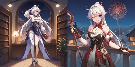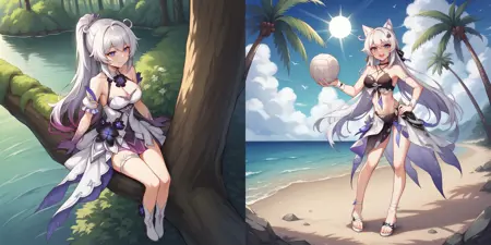 Interesting Facts: In case you are curious about how both of LoRAs function. When training Kiana's LoRA I made sure to prompt each image, which has Rice Cake with "snake, white snake", that allowed Ai to know how Rice Cake usually appears with Kiana. By itself it would generate just your regular Snake. So after that I trained a LoRA with just Rice Cake with the same "snake, white snake". With both of them combined Rice Cake appears anywhere you want pretty much: "snake on shoulder" "snake on hand" "snake on head" etc. all of these will generate Rice Cake in those places. It's not perfect, but I'm already happy that it works.