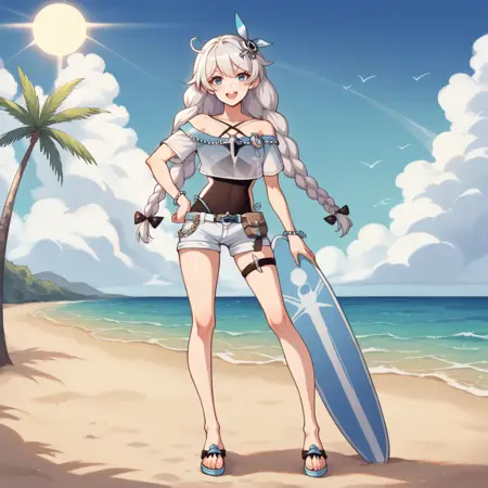 KianaHi3, Fol003, Kia_Sbr, white hair, blue eyes, kiana kaslana,  ahoge, twin braids, black one-piece swimsuit, cropped shirt, light blue shirt, see-through shirt, off-shoulder shirt, swimsuit under clothes, sideless outfit, black ribbon, side-tie, cutoffs, light blue cutoffs, belt pouch, yelllow belt, anchor, multiple thigh straps, innertube, bead bracelet, criss-cross straps, seashell hair ornament, blue flip flops