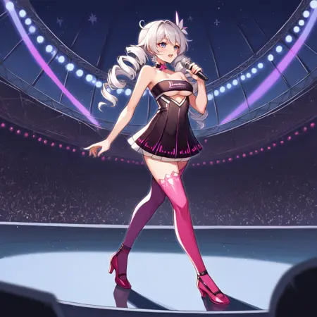 KianaHi3, Fol001, Kia_Wrd, white hair, blue eyes, kiana kaslana,  short dress, black dress, tube top, idol clothes, underboob cutout, drill hair, twin drills, ahoge, flower choker, covered collarbone, cleavage, see-through skirt, pleated skirt, black skirt, purple thighhighs, thighhighs,