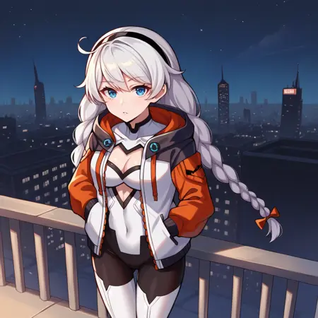 KianaHi3, Fol001, Kia_Def, long hair, white hair, blue eyes, kiana kaslana, bodysuit, white bodysuit, twin braids, ahoge, headband, black trim, thigh boots, white legwear, cleavage cutout, white jacket, open jacket, hooded jacket, bike shorts, orange sleeves, long sleeves, white gloves, gloves, covered navel, masterpiece, best quality, ultra-detailed, very aesthetic, newest, scenery, absurdres, perfect anatomy, perfect legs, perfect face, perfect eyes,