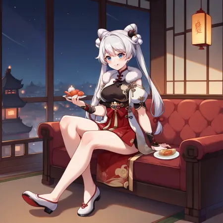 KianaHi3, Fol002, Kia_Ftb, white hair, blue eyes, kiana kaslana,  double hair bun, twintails, china dress, pleated dress, multicolored dress, alt white dress, hair tassel, sash, tassel, red skirt, pleated skirt, shorts under dress, black wrist guards, fur capelet, puffy short sleeves, alt white sleeve