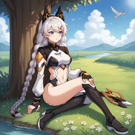 KianaHi3, Fol003, Kia_Bst, white hair, blue eyes, kiana kaslana,  armored leotard, two-tone leotard, white leotard, black leotard, stomach cutout, navel, alternate thigh boots, black footwear, alt covered breasts, shrug (clothing), black shrug, mechanical ears, fake animal ears, hairclip, fingerless gloves, alt black gloves, mechanical tail, alt detached sleeves, alternate white sleeves, alternate long sleeves,