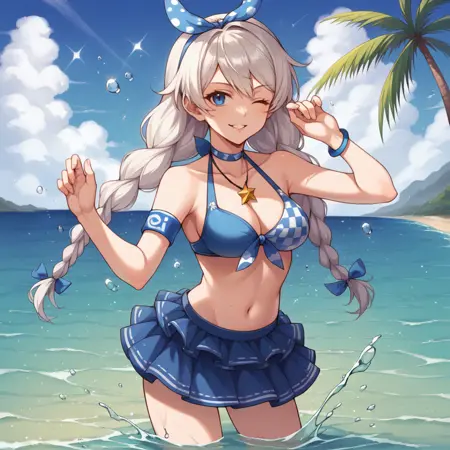 Kiana_Swimsuit, swimsuit, star ornament, blue bikini, choker, necklace, arm band, bracelet, hairband, front-tie bikini top, bikini skirt,