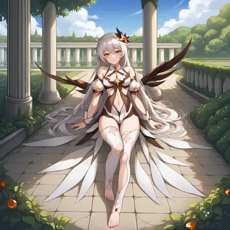 KianaHi3, Fol003, Kia_Knm, white hair, blue eyes, kiana kaslana,  twin braids, ahoge, armored corset, white corset, black halter top, breastplate, blue arm strap, covered navel, white breastplate, bare shoulders, alt cross hairclip, alt hairband, hair wings, alt short shorts, alternate black shorts, garter straps, blue belt, leg armor, alternative thighhighs, alt black thighhighs, armored gloves, alternate long gloves, alternative white gloves,