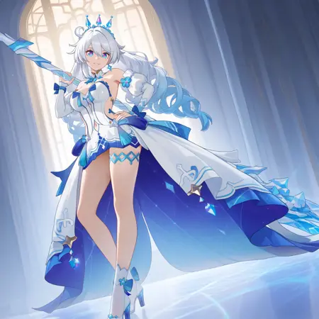 KianaV85Snw, KianaSnw, 白髪, グラデーション髪, 長髪, 水色髪, ドリル髪, ツインドリル, アホ毛, キアナ・カスラナ, 記号形の瞳, 青い目, ピンクの瞳, ティアラ, クラウン, 衣装カットアウト, 髪飾り, 片方のイヤリング, 青い宝石, 胸元リボン, 胸元露出, 外れ襟, へそ, 白い襟, 白いドレス, サイドレス, バストレスドレス, 青いリボン, へそカットアウト, 中央カットアウト, 白いスカート, 青いスカート, 肩露出, 太もも露出, ハイロースカート, 外れ袖, ジュリエット袖, 青い花, 領結の宝石, ペンダント, 白い袖, 袖口, 手首リボン, グラデーションタッセル, 水色タッセル, ハイヒール, 白い靴, 白い靴下,