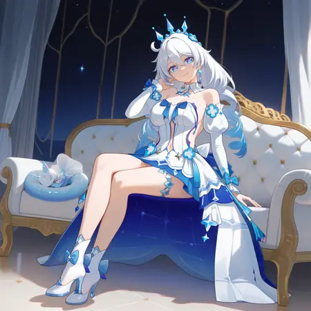 KianaV85Snw, KianaSnw, white hair, gradient hair, long hair, light blue hair, drill hair, twin drills, ahoge, kiana kaslana, symbol-shaped pupils, blue eyes, pink pupils, tiara, crown, clothing cutout, hair ornament, single earring, blue gemstone, chest ribbon, cleavage, detached collar, navel, white collar, white dress, sideless dress, strapless dress, blue ribbon, navel cutout, center cutout, white skirt, blue skirt, bare shoulders, thighlet, high-low skirt, detached sleeves, juliet sleeves, blue flower, collar jewel, pendant, white sleeves, sleeve cuffs, wrist bow, gradient tassel, light blue tassel, high heels, white footwear, white socks,