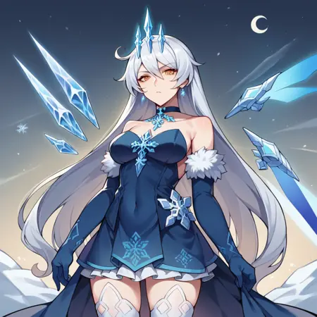HoV_Empress, 어깨 노출, 얼음 왕관, 힐 부츠, 파란 신발, 흰 허벅지 양말, 초커, 파란 드레스, 어깨 없음 드레스, 주름진 치마, 털 트림 장갑, 팔꿈치 장갑, 파란 장갑, 눈송이,