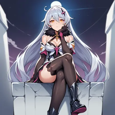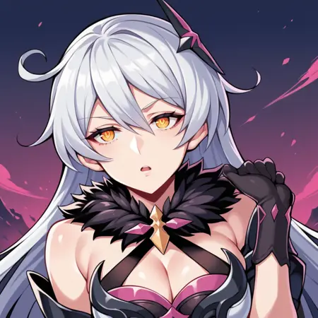 KianaHi3, Fol004, Kia_Hov, 흰 머리, 노랑 눈, 키아나 카슬라나, 갑옷 드레스, 흰 갑옷, 대안 검은 드레스, 홀터넥, 털 칼라, 어두운 성격, 아호게, 보라색 테두리, 드러난 어깨, 대안 고무줄 허벅지양말, 대안 검은 허벅지양말, 허벅지 띠, 주황색 날개, 에너지 날개, 대안 머리 장식, 대안 비대칭 장갑, 어긋난 장갑, 한쪽 팔꿈치 장갑, 갑옷 장갑,