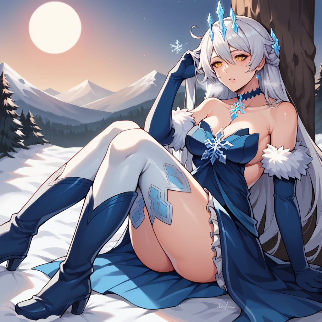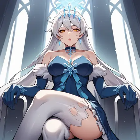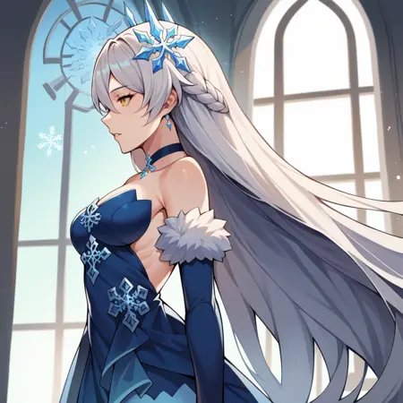 KianaHi3, Fol004, Kia_Emp, 흰 머리, 노랑 눈, 키아나 카슬라나, 어두운 성격, 털 장식 드레스, 아호게, 스트랩리스 드레스, 진한 파란 드레스, 눈송이, 파란 왕관, 파란 귀걸이, 파란 날개, 대안 에너지 날개, 긴 털 장식 장갑, 대안 긴 장갑, 파란 장갑, 그라데이션 허벅지양말, 연한 파란 허벅지양말, 연한 파란 목걸이, 진한 파란 목걸이, 눈송이 무늬, 드러난 어깨, 겨울 부츠, 파란 신발,