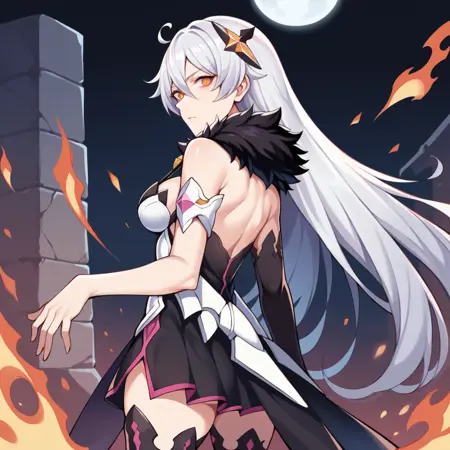 KianaHi3, Fol005, Kia_Hof, 흰 머리, 파란 눈, 키아나 카슬라나, 홀터 드레스, 갑옷 스커트, 대안 흰 드레스, 흉갑, 흰 흉갑, 가슴 선 자르기, 대안 분리된 소매, 드러난 어깨, 갑옷 소매, 대안 홀터넥, 가슴 선, 장갑, 대안 검은 장갑, 십자가 귀걸이, 팔꿈치 장갑, 불꽃, 타는 옷, 빨간 캐프, 떠다니는 캐프, 검은 티아라, 꼬리머리, 깃털 머리 장식, 대안 허벅지 부츠, 대안 흰 신발,