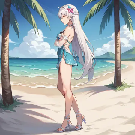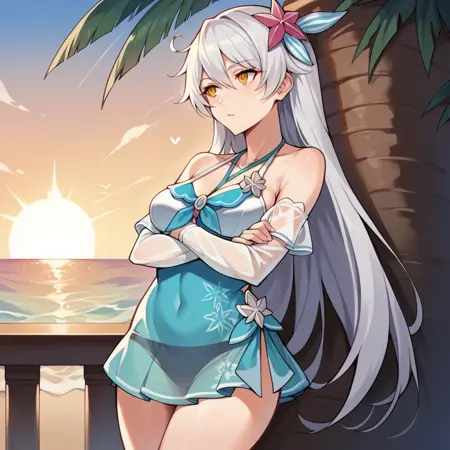 KianaHi3, Fol004, Kia_Sud, 흰 머리, 노랑 눈, 키아나 카슬라나, 어두운 성격, 아호게, 선데이레스, 별 모양 머리 장식, 리본 목걸이, 대안 검은 목걸이, 반투명 옷, 비키니 바닥만, 대안 홀터넥, 별 무늬, 반투명 스커트, 옷 아래 비키니, 연한 파란 드레스, 반투명 소매, 진주 귀걸이, 대안 흰 소매, 불룩한 긴 소매, 앞쪽 매듭 탑, 여러 팔찌, 대안 분리된 소매,