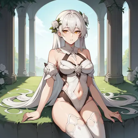 Kiana_Def, 흰 바디슈트, 머리 장식, 긴 소매, 젖가슴 절개,