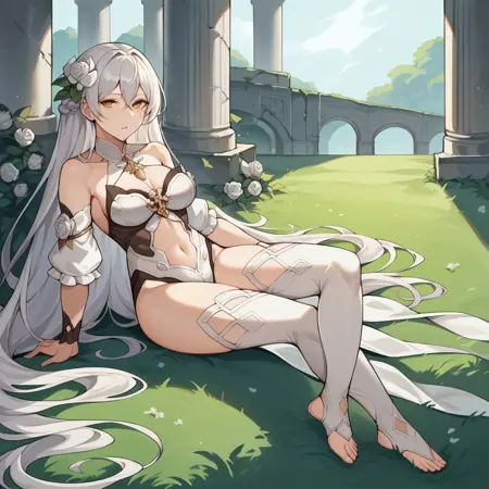 HoV_Magic, 배꼽, 어깨 노출, 흰 허벅지 양말, 흰 레오타드, 머리꽃, 흰 꽃