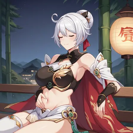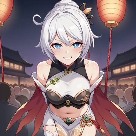 KianaHi3, Fol005, Kia_Fes, 하얀 머리, 파란 눈, 키아나 카슬라나, 중국 복장, 소매 없는 셔츠, 커트된 탑, 흰 셔츠, 대체 가슴판, 검은 가슴판, 보석, 대체 단일 허벅지 양말, 대체 흰 허벅지 양말, 진한 빨간 망토, 타버린 망토, 대체 보석, 단일 머리 둥, 미니 치마, 대체 흰 치마, 대체 복부, 배꼽, 대체 젖가슴 절개, 대체 검은 목선, 다른 분리된 소매, 검은 소매, 대체 긴 소매,