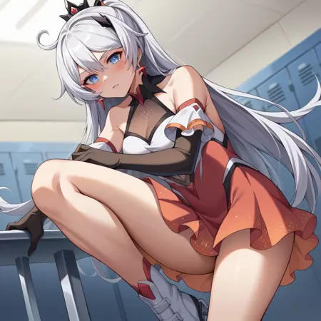 KianaHi3, Fol002, Kia_Vod, white hair, blue eyes, kiana kaslana, zipper dress, partially unzipped, orange eyes, clothing cutout, bodystocking, crop top, white crop top, collared shirt, black collar, black capelet, capelet, orange strap, orange zipper, single thighhigh, gartered thighhighs, black thighhighs, thigh strap, asymmetrical gloves, black gloves, hair ornament, bracelet, white belt, loose belt, shorts, alt black shorts,
