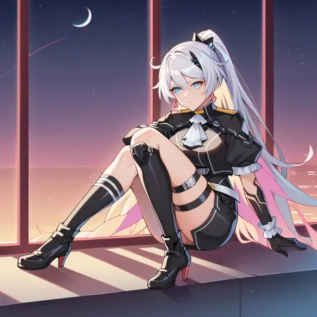 KianaHoFinHi3, Khf_Anv, pink pupils, long hair, symbol-shaped pupils, blue eyes, kiana kaslana, white hair, purple hair, gradient hair, white apron, apron, ponytail, white ribbon, hair ribbon, white shirt, collared shirt, shoulder cutout, bare shoulders, two-sided sleeves, white sleeves, purple sleeves, frilled sleeves, purple belt, shoulder belt, pin, purple ascot, frilled ascot, two-sided gloves, black gloves, white gloves, gold bracelet, long skirt, two-sided skirt, side slit, black shorts, shorts under skirt, big bow, purple bow, white footwear, high heel boots, white socks, single sock,