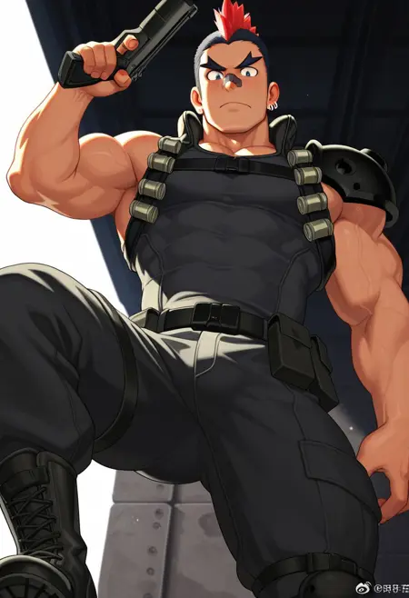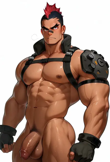 kinagase_tsumugu, bandaid on nose, two tone hair, buzzcut red mohawk, earrings, forked eyebrows, mohawk, sideburns, bara