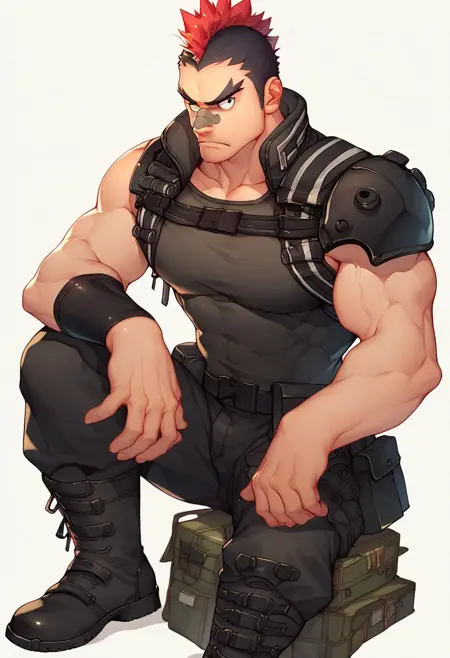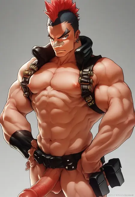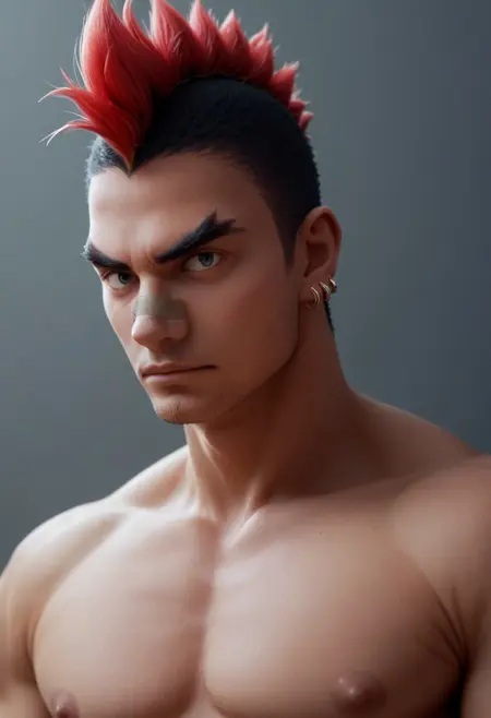 kinagase_tsumugu, bandaid on nose, two tone hair, buzzcut red mohawk, earrings, forked eyebrows, mohawk, sideburns, bara