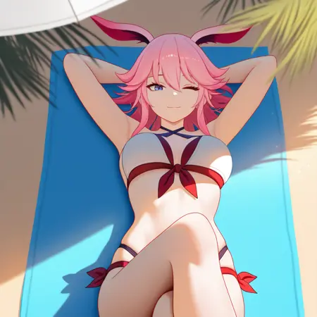 YaeSa, Fol001, Ysk_Smd, yae sakura, blue eyes, pink hair, long hair, white bikini, red criss-cross halter, front-tie bikini top, maroon side-tie bikini bottom, panty straps, mismatched bikini,