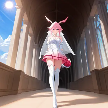 YaeSa, Fol003, Ysk_Drr, yae sakura, blue eyes, pink hair, strapless dress, wedding dress, crystal necklace, alternate detached sleeves, white juliet sleeves, alt sleeves past elbows, alt pink skirt, alt frilled skirt, gradient skirt, thigh boots, white footwear, bridal veil,