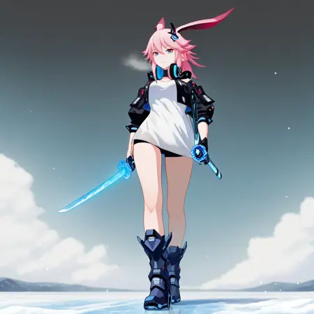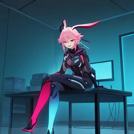YaeSa, Fol004, Ysk_Neo, yae sakura, blue eyes, pink hair, armored bodysuit, black bodysuit, turtleneck bodysuit, neon trim, light blue hair, streaked hair, headgear, asymmetrical legwear, miscolored legwear, asymmetrical gloves, armored gloves, asymmetrical bodysuit,