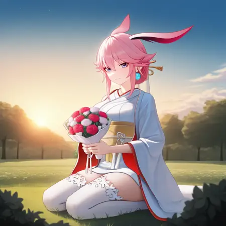 YaeSa, Fol001, Ysk_Sbl, yae sakura, blue eyes, pink hair, wedding kimono, short kimono, alt white kimono, white coat, open coat, japanese clothes, alt sash, yellow sash, red colored inner coat, white ribbon, bell, flower-trimmed thighhighs, alt white thighhighs, white tassel, hair ornament, tassel earrings, long sleeves, white sleeves,