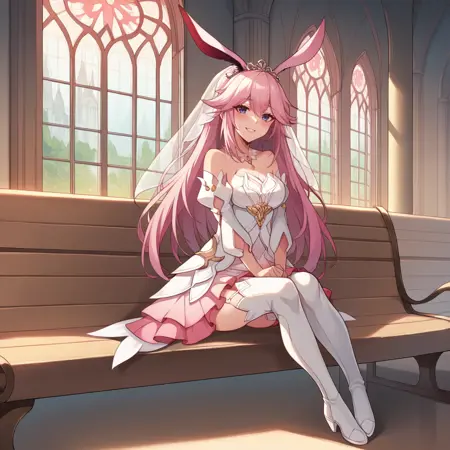 YaeSa, Fol003, Ysk_Drr, yae sakura, blue eyes, pink hair, strapless dress, wedding dress, crystal necklace, alternate detached sleeves, white juliet sleeves, alt sleeves past elbows, alt pink skirt, alt frilled skirt, gradient skirt, thigh boots, white footwear, bridal veil,